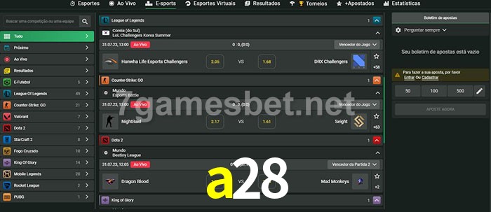 O a28 oferece uma grande seleção de opções de apostas em e-sports com probabilidades competitivas